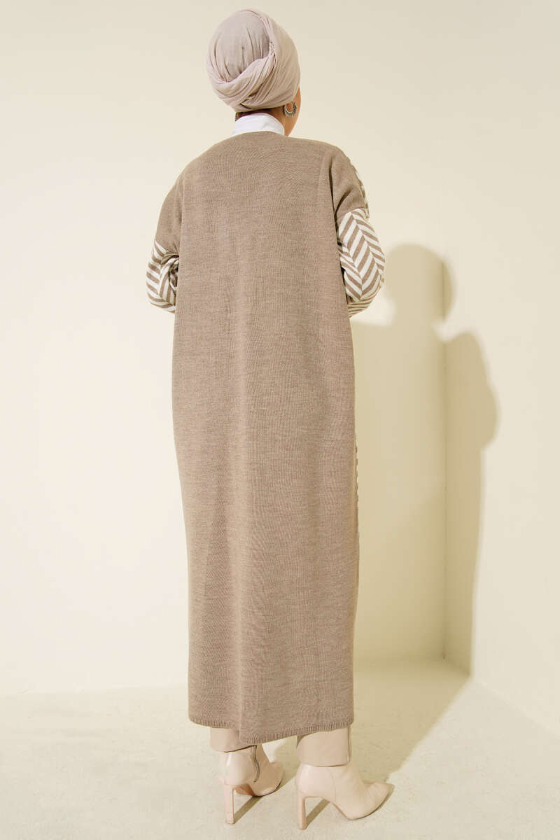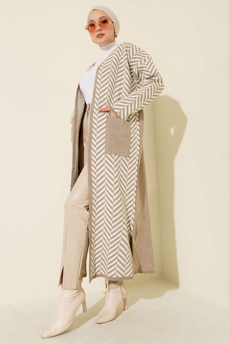 Zikzak Çizgili Desenli Uzun Triko Hırka Bej Kahve
