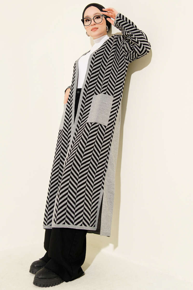 Zikzak Çizgili Desenli Uzun Triko Hırka Gri Siyah