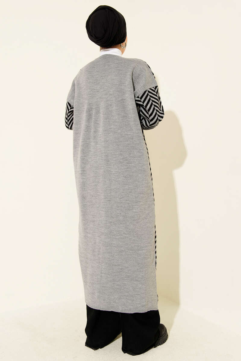 Zikzak Çizgili Desenli Uzun Triko Hırka Gri Beyaz