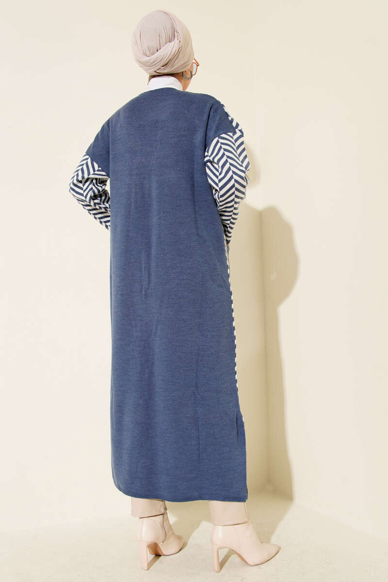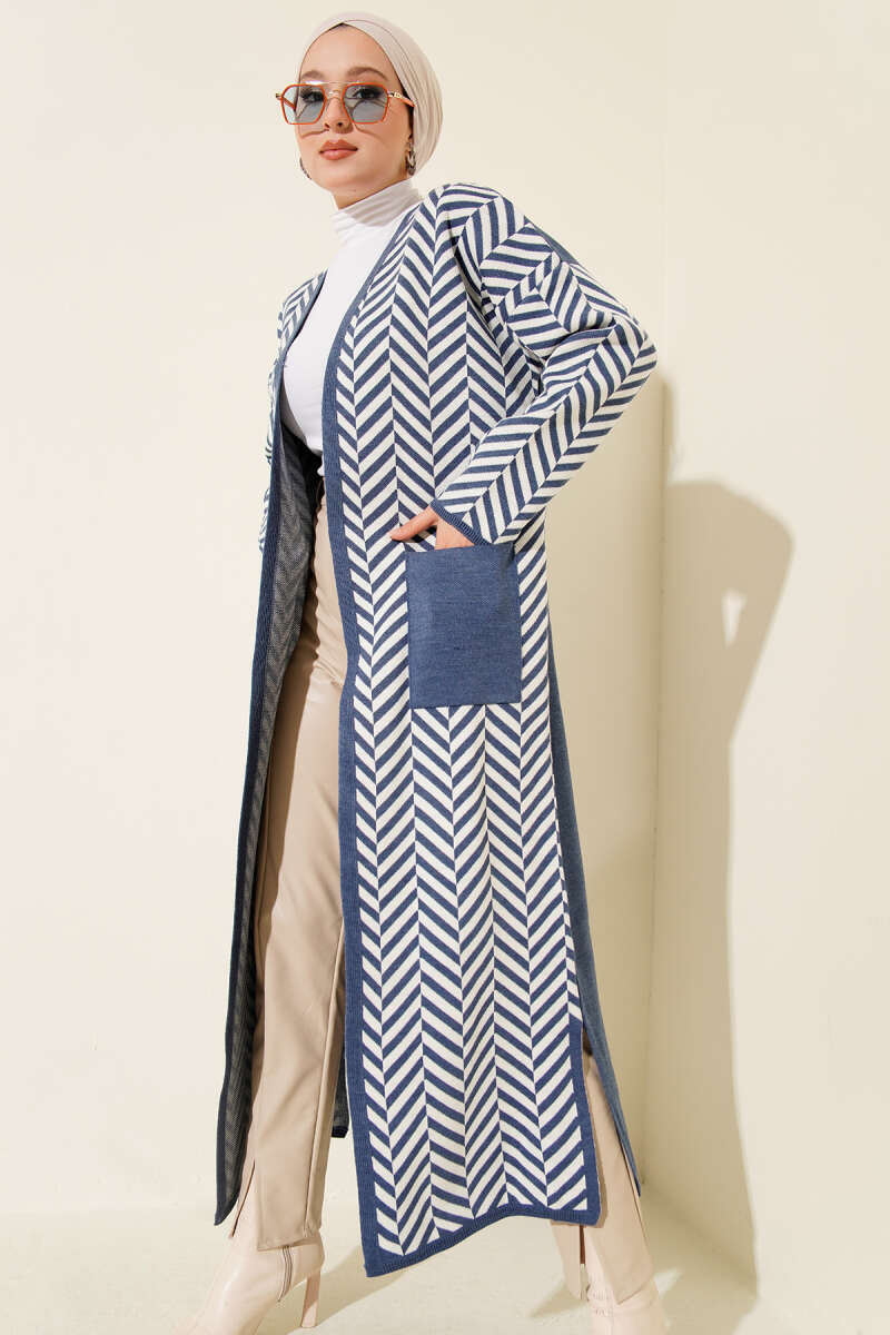 Zikzak Çizgili Desenli Uzun Triko Hırka İndigo
