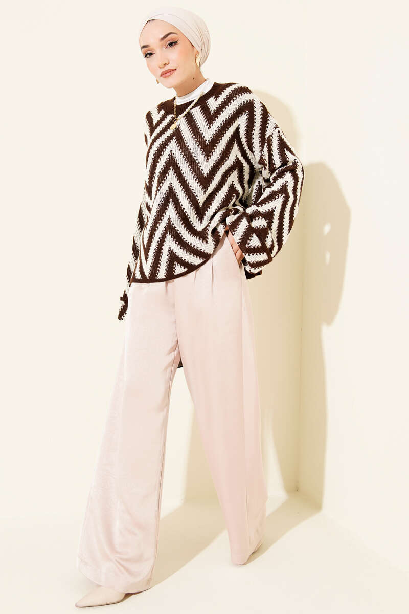 Zikzak Desen Ajurlu Triko Kazak Kahve