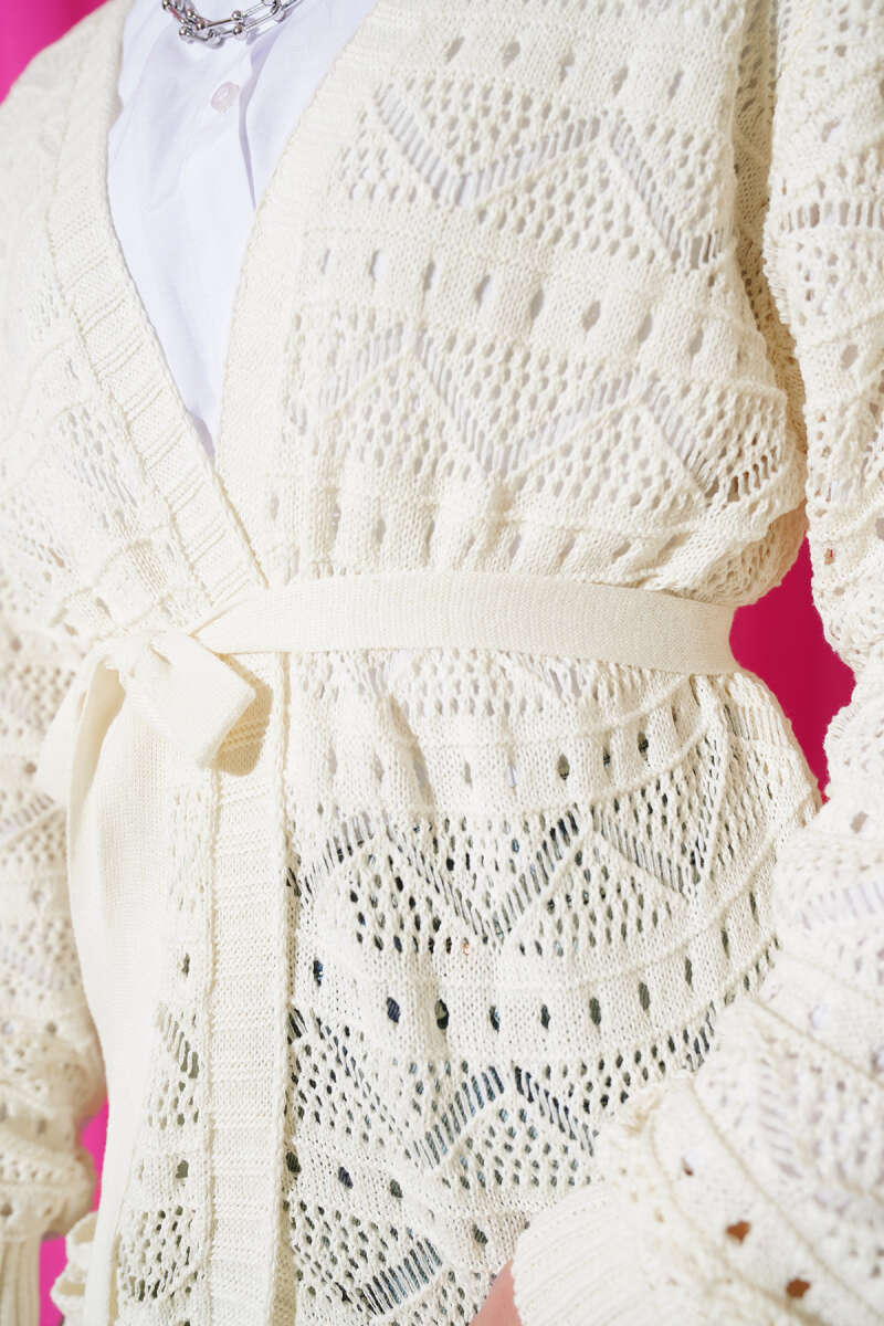 Zikzak Desenli Delikli Kuşaklı Triko Hırka Siyah