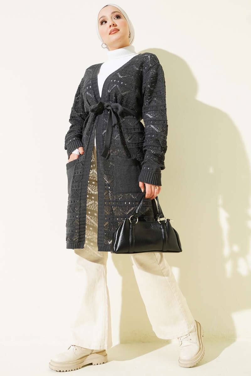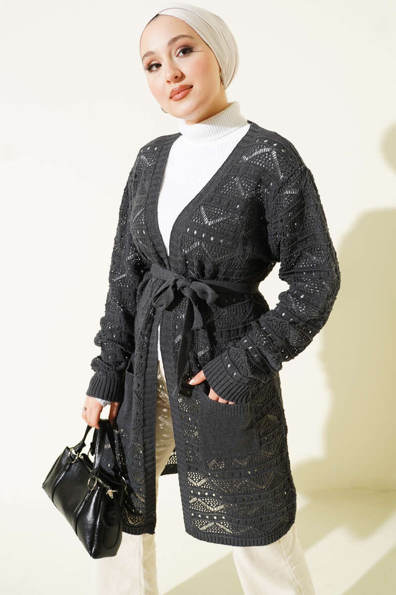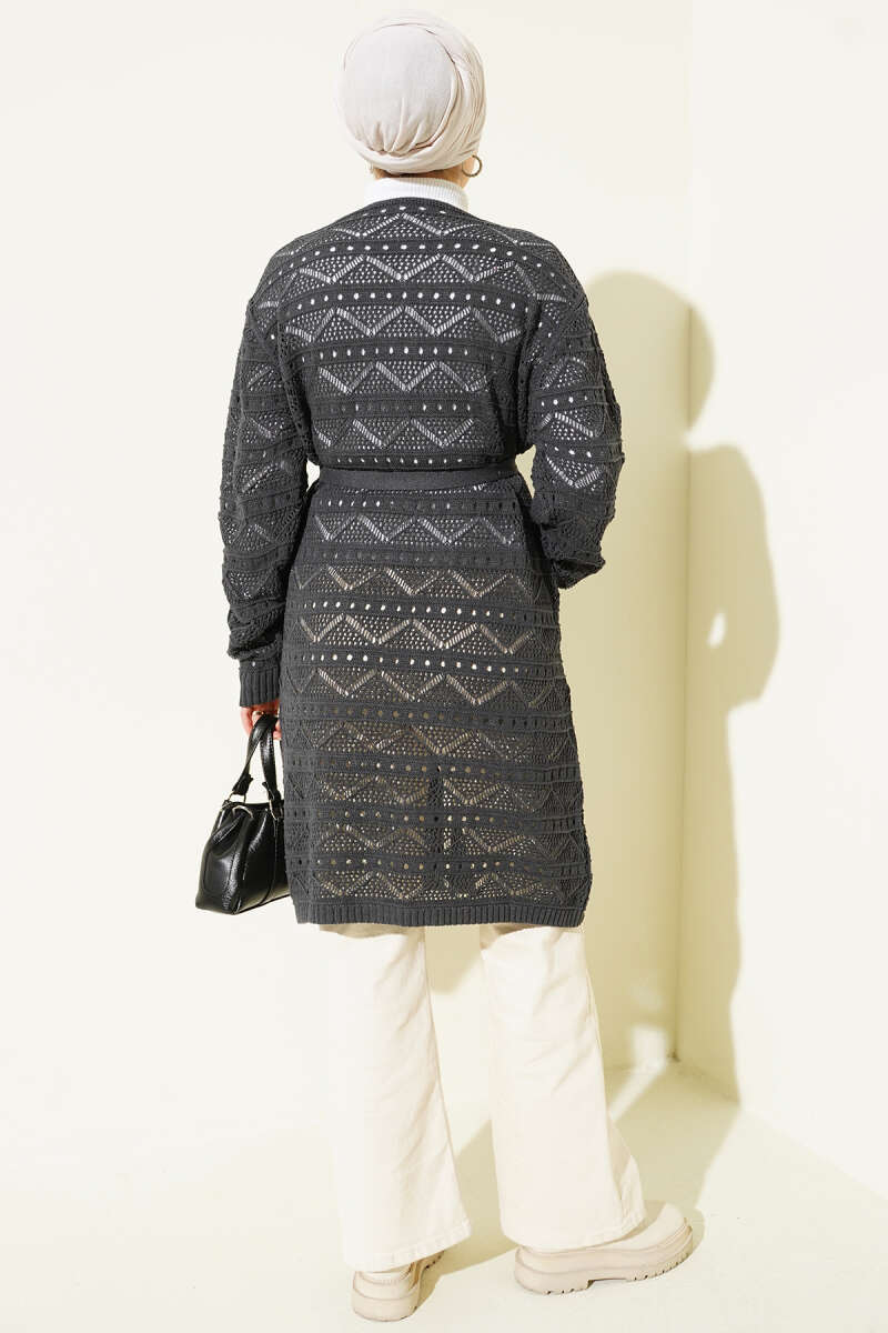 Zikzak Desenli Delikli Kuşaklı Triko Hırka Gri