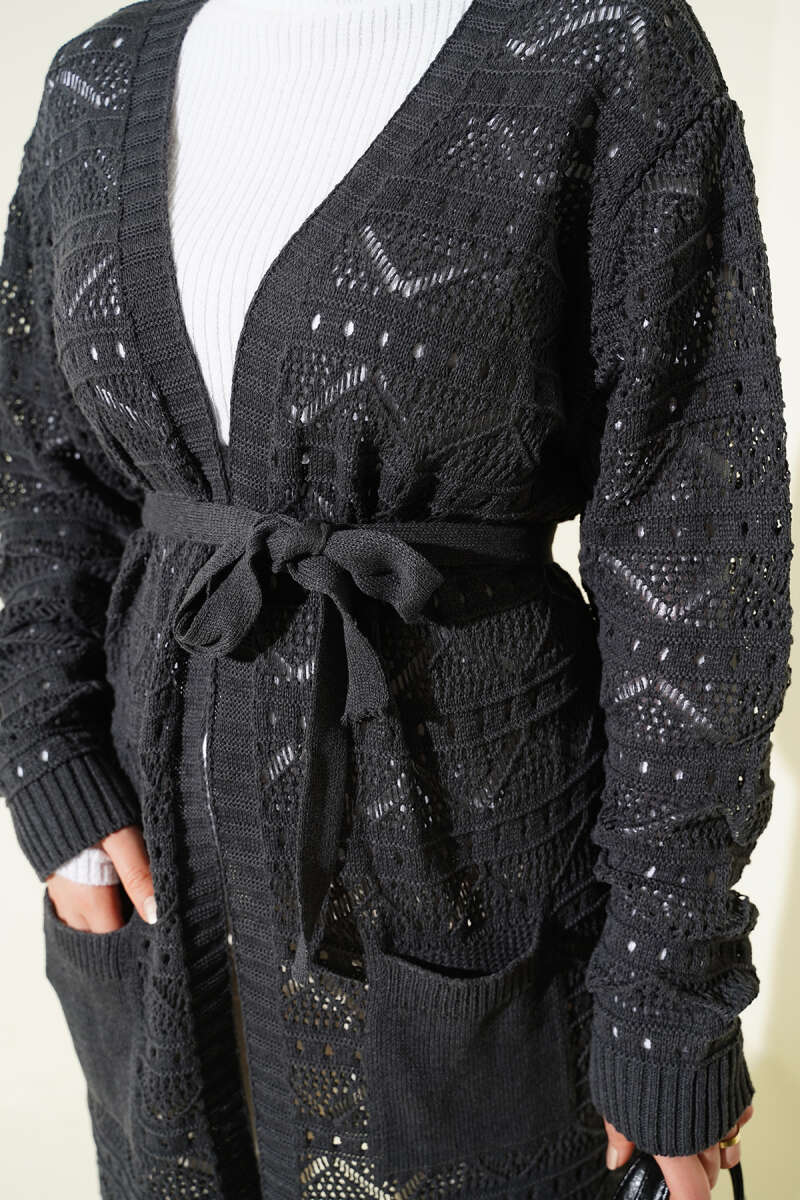 Zikzak Desenli Delikli Kuşaklı Triko Hırka Kahve