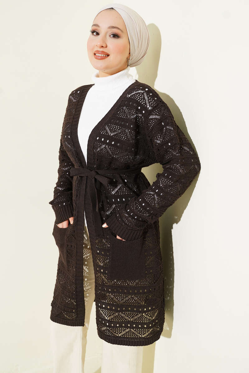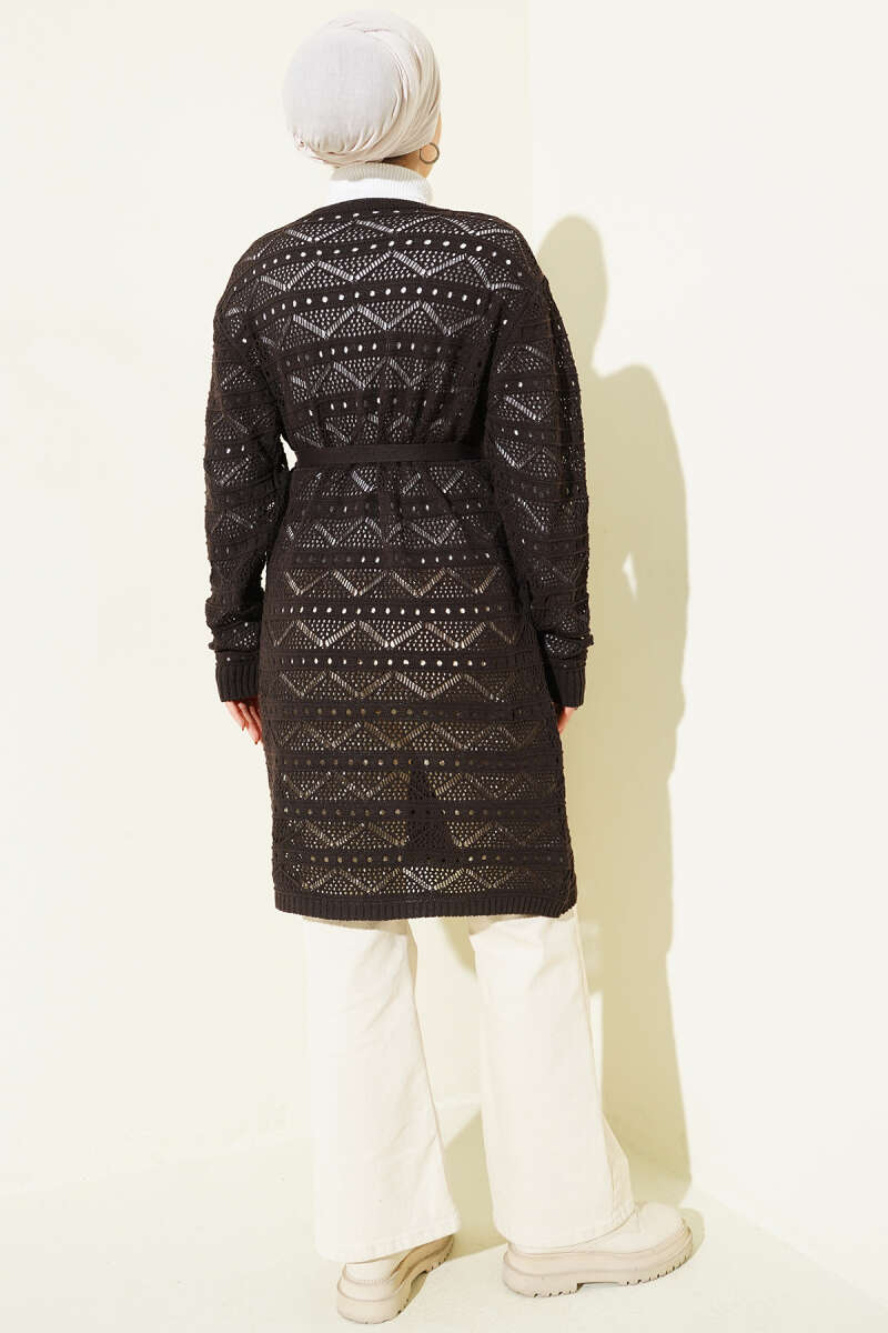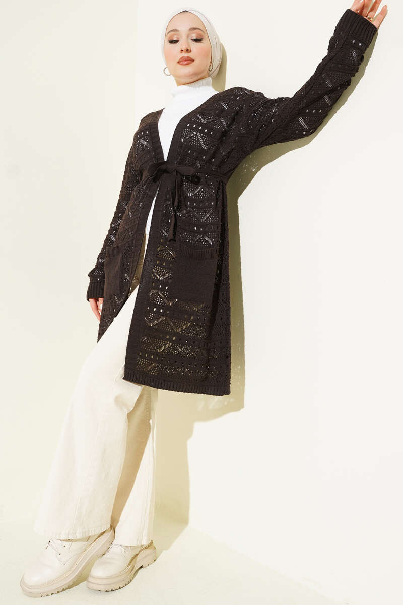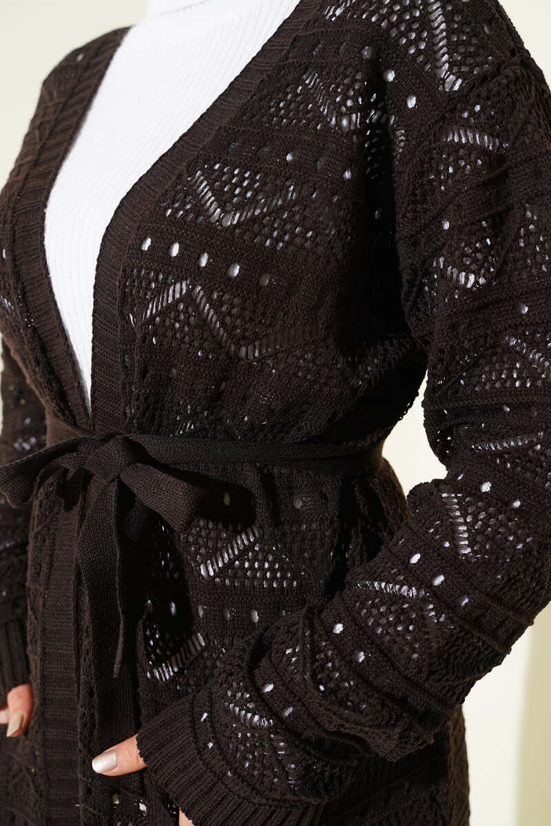 Zikzak Desenli Delikli Kuşaklı Triko Hırka Kahve