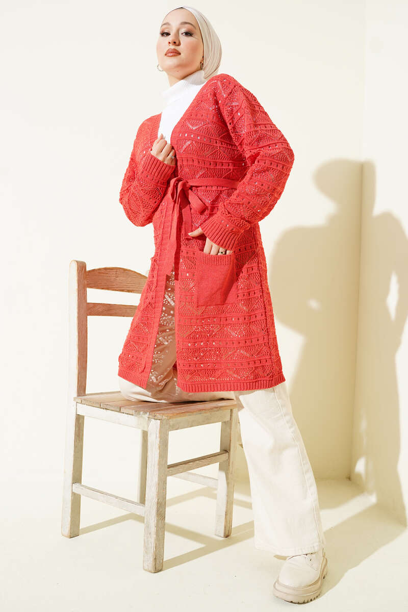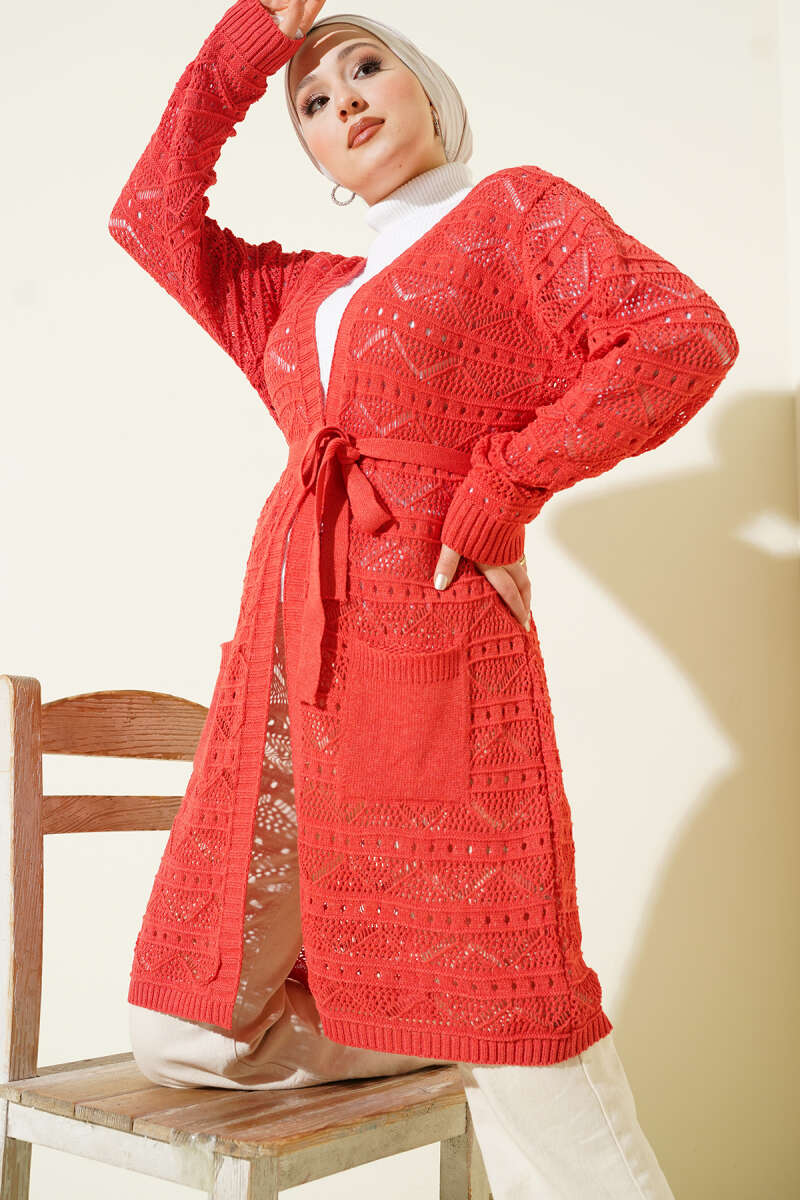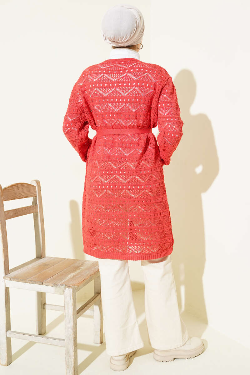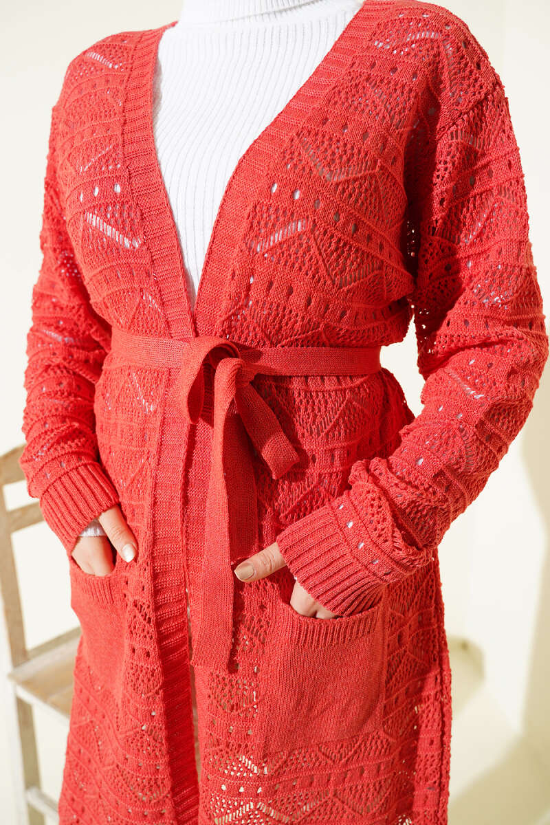 Zikzak Desenli Delikli Kuşaklı Triko Hırka Bordo
