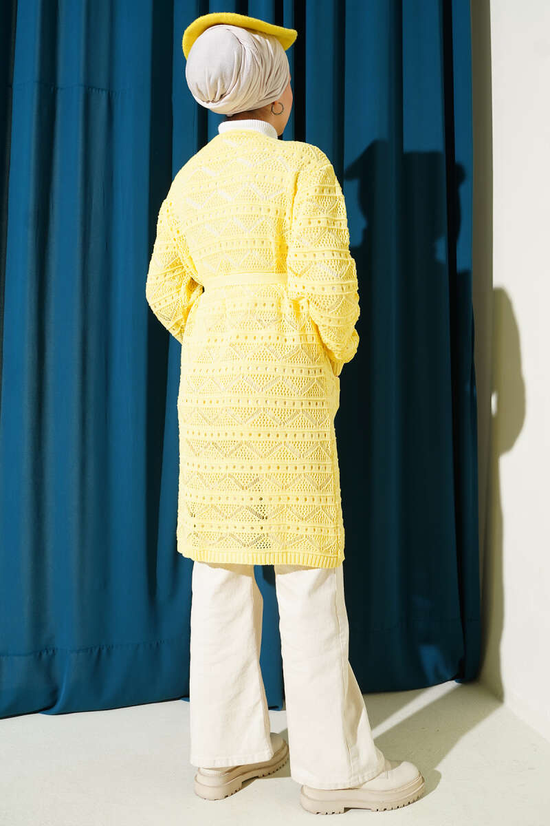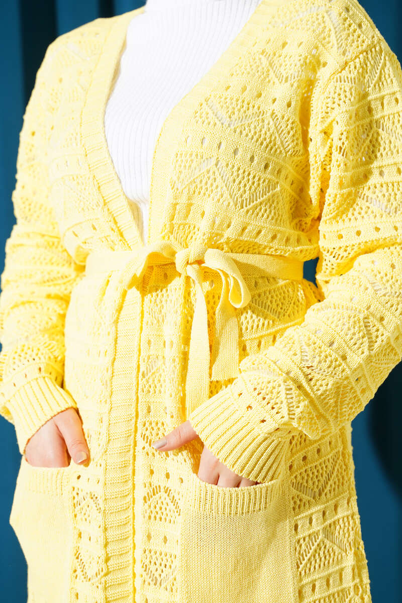 Zikzak Desenli Delikli Kuşaklı Triko Hırka Sarı