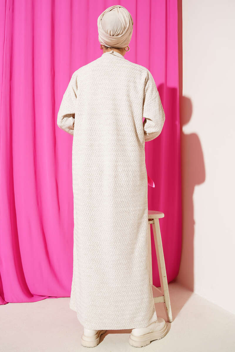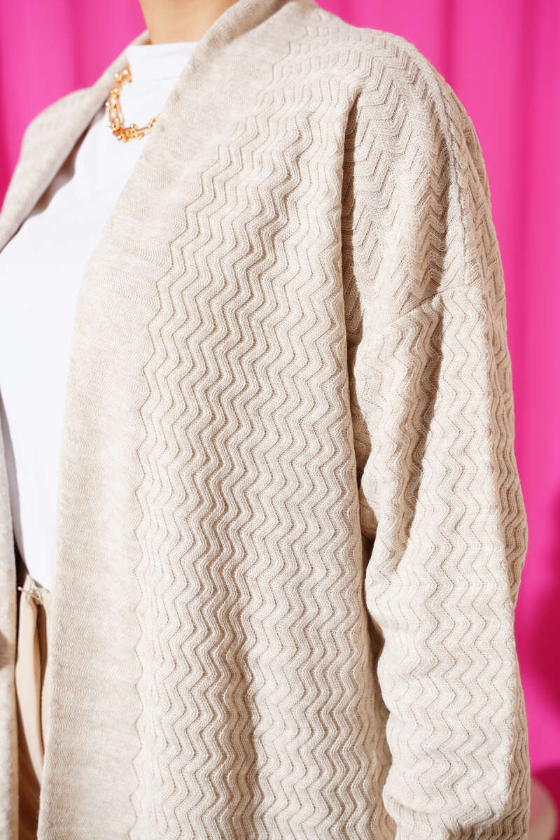 Örgü Kabartma Desenli Uzun Triko Hırka Bej