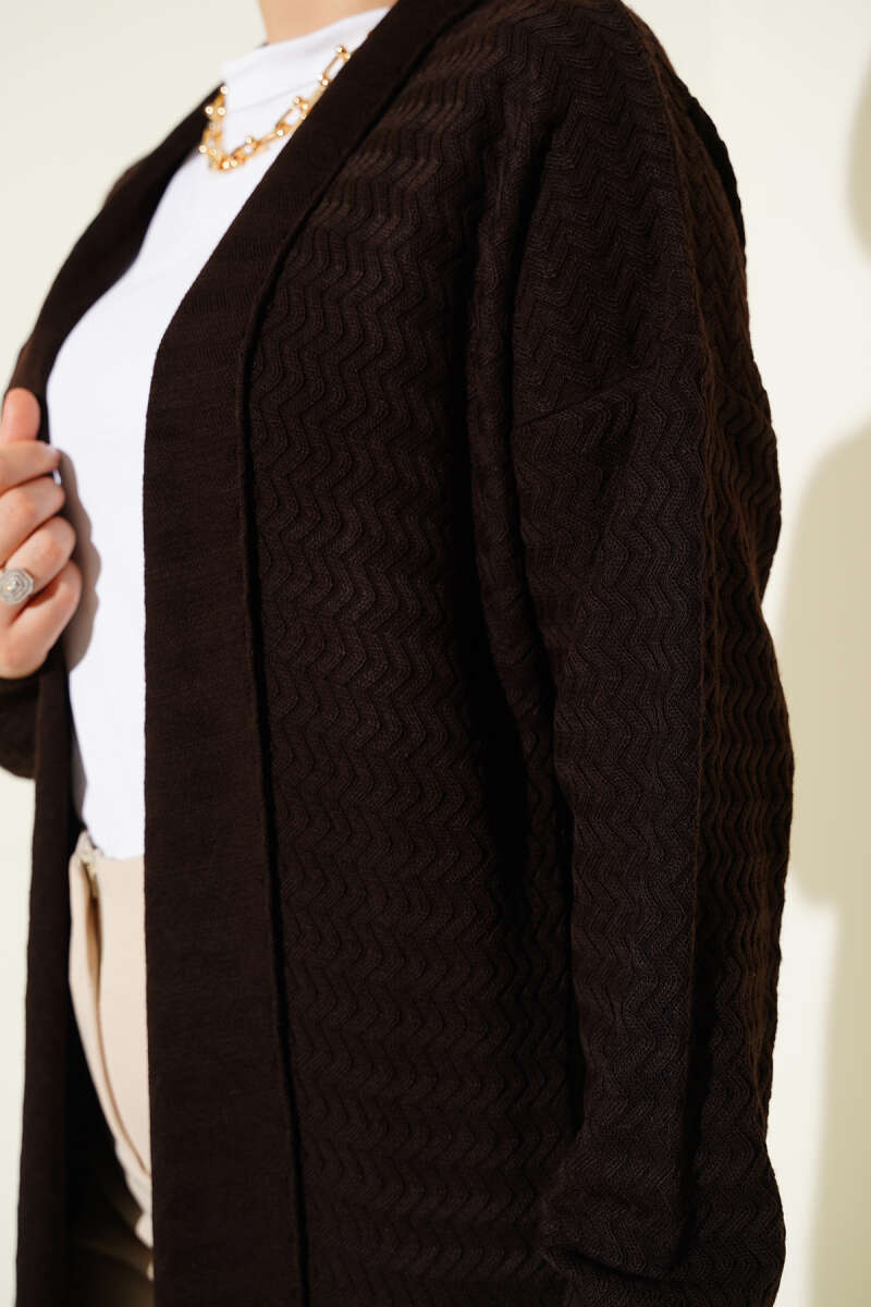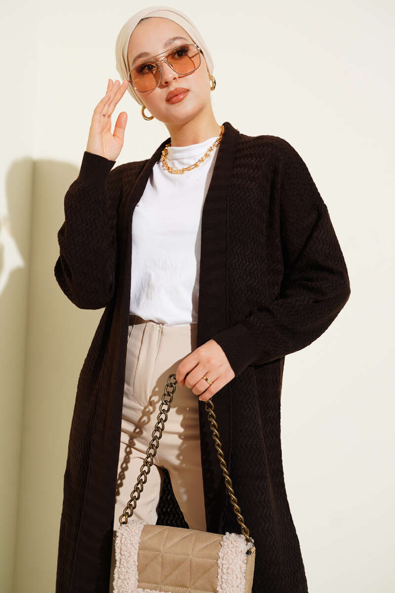 Zikzak Desenli Uzun Triko Hırka Kahve