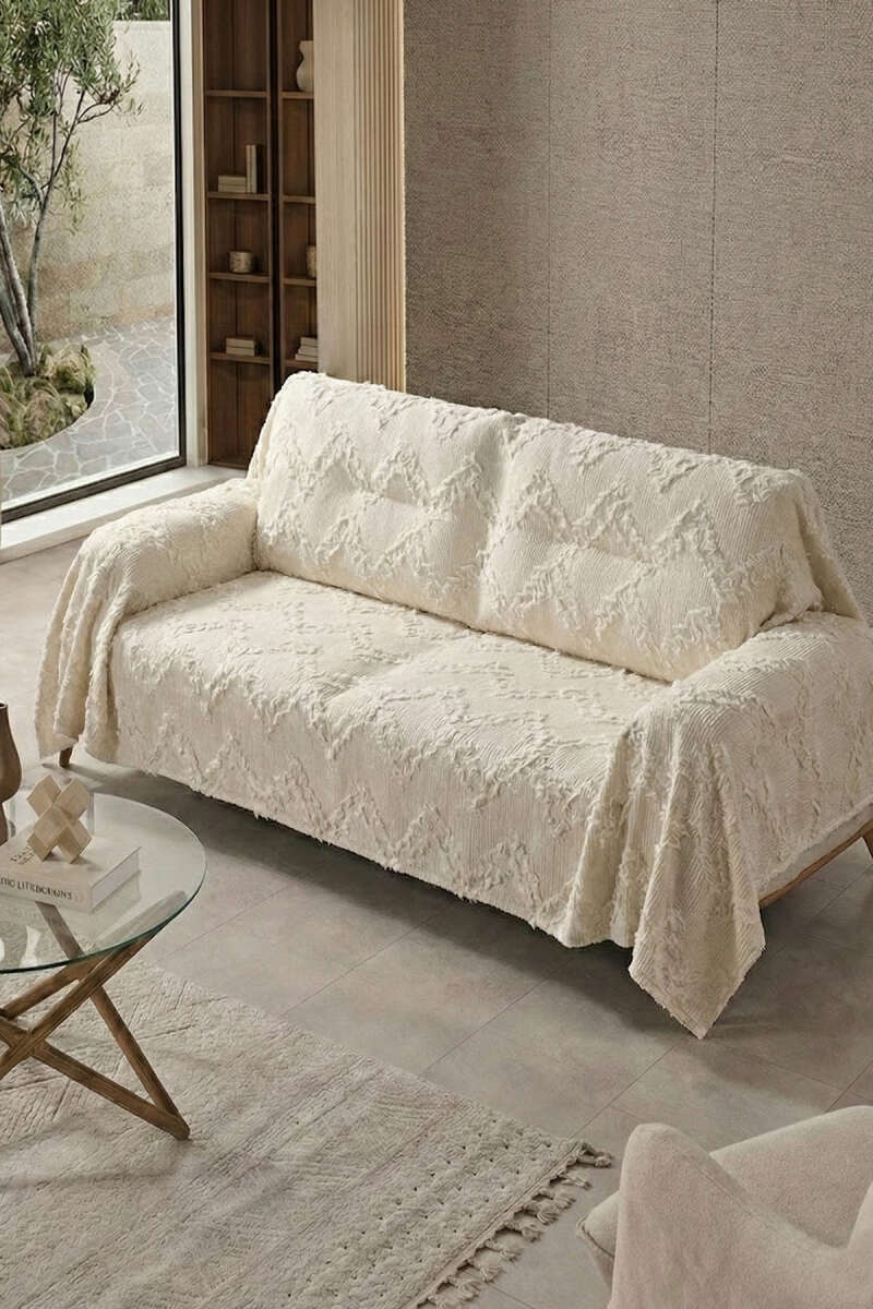 Zikzak Saçaklı Koltuk Örtüsü Bej