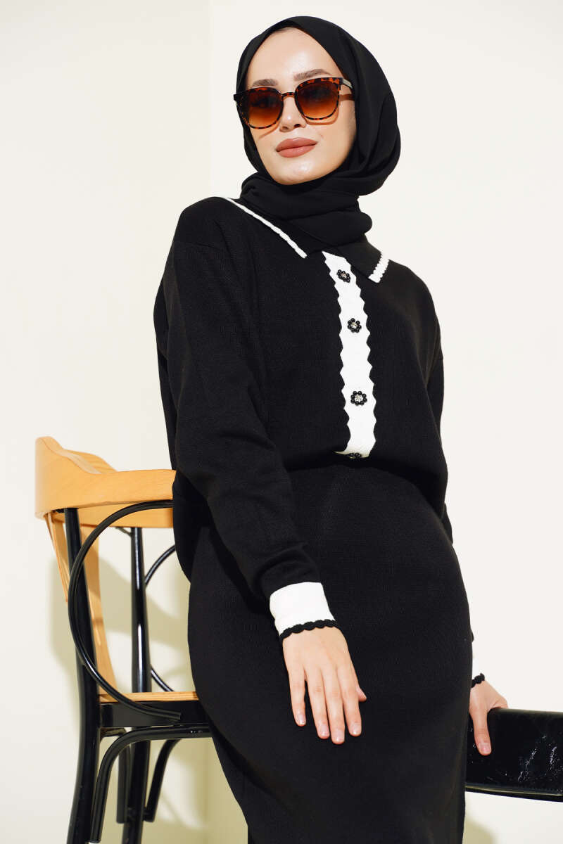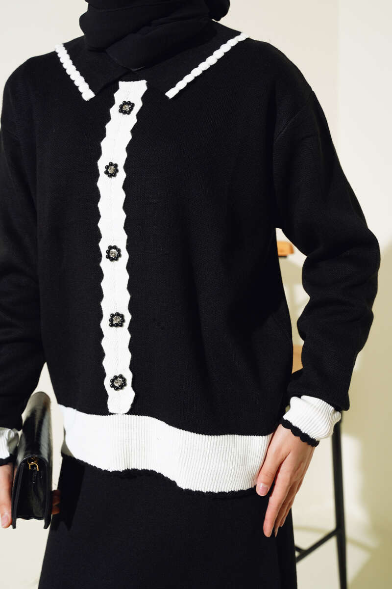 Balon Kol Balıkçı Yaka Triko İkili Takım Siyah