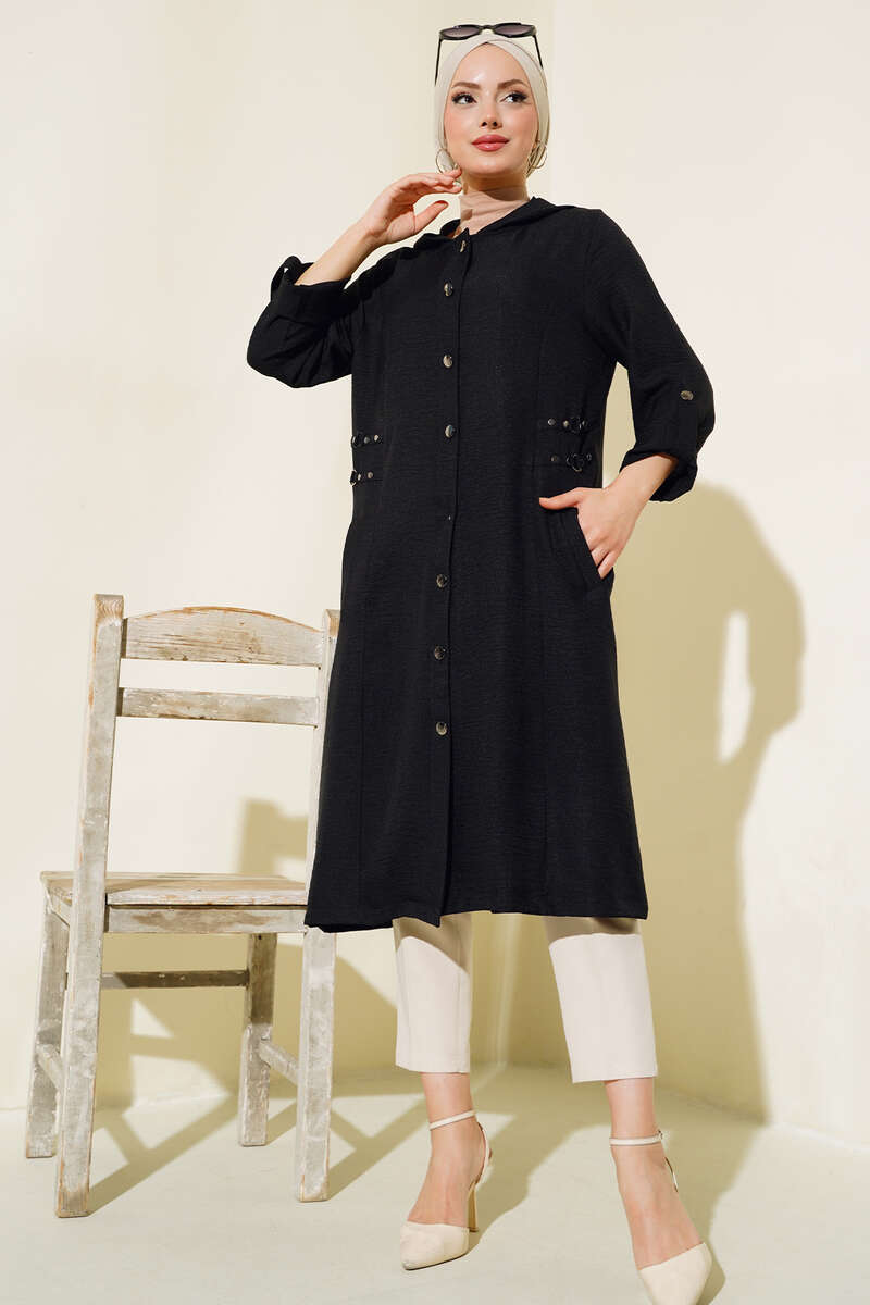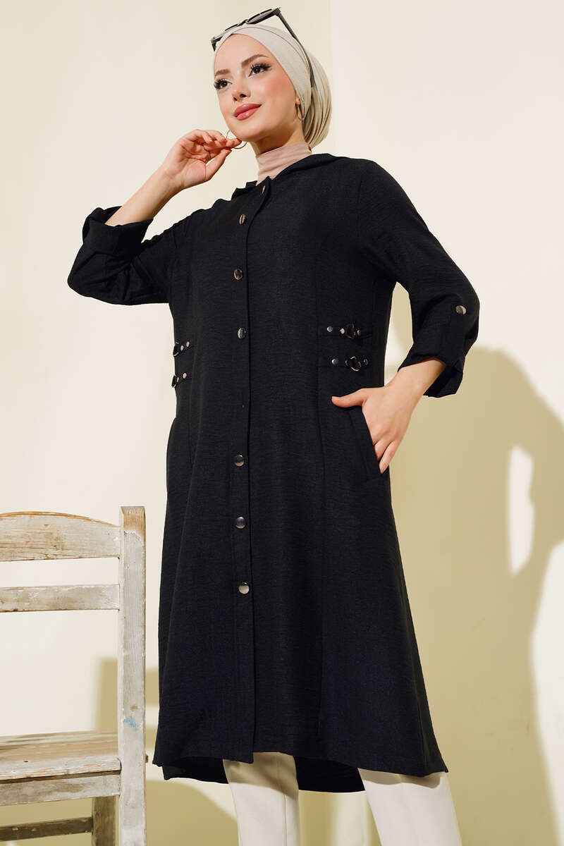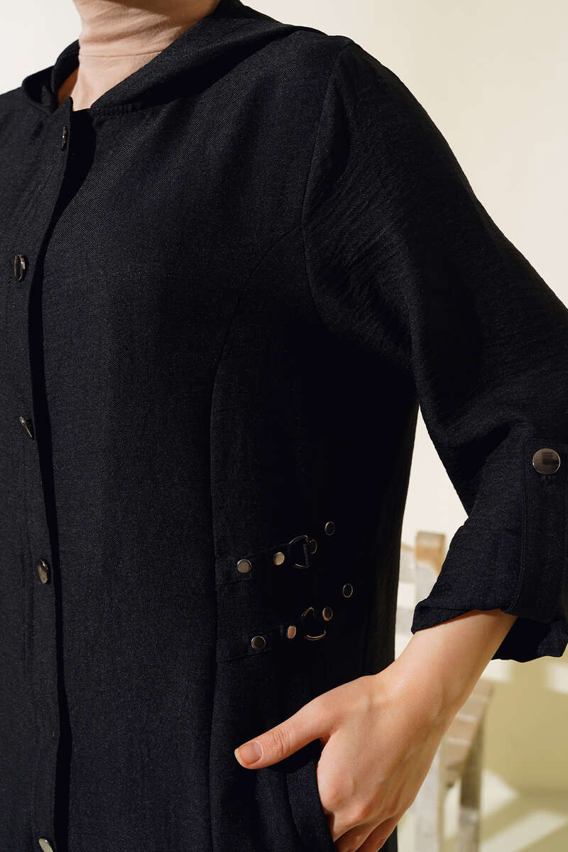 Zımba Detaylı Kapüşonlu Kap Siyah