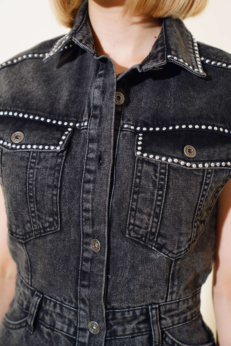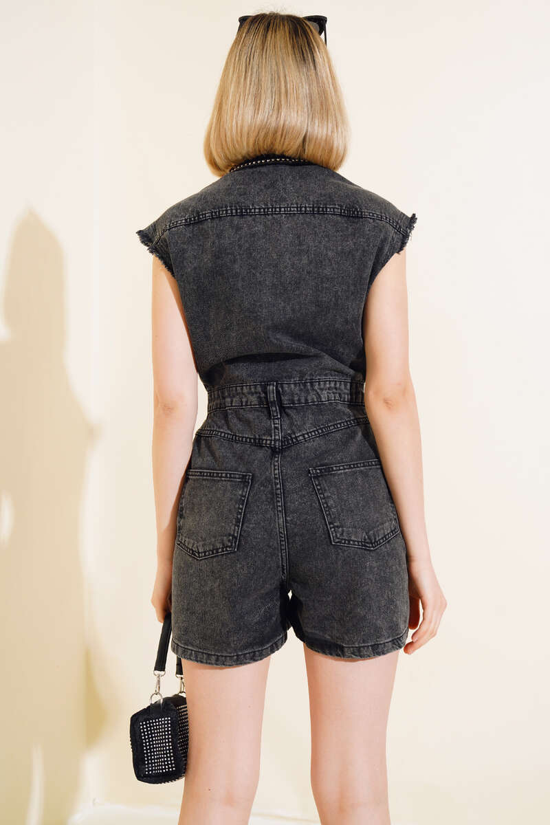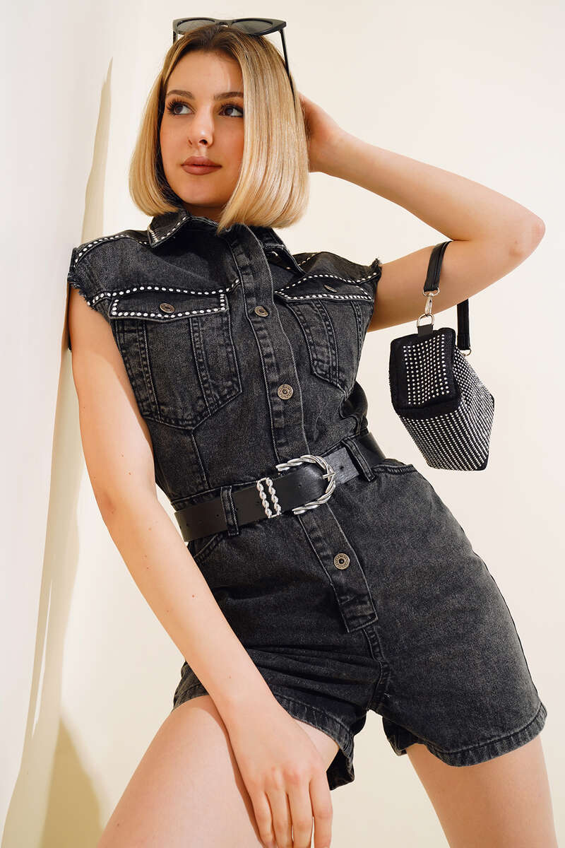 Yeni sezon tulum modelimiz sizlerle beraber. Tulumumuz sıfır kol modeldir. Önü yarım düğmelidir. Belinde üç adet kemer köprüsü vardır. Tulumumuzun göğsünde iki adet kapaklı cebi vardır. Kolu püskül detaylıdır. Önü zımba detaylar mevcuttur. Kot tulumumuzun iki önde iki arkada cebi vardır. Hem şık hem sportif tulumumuz tam size göre.