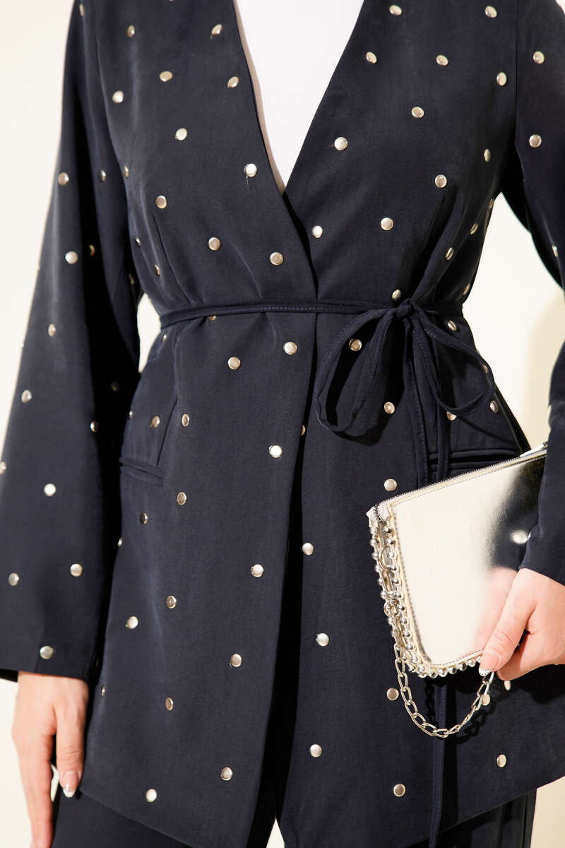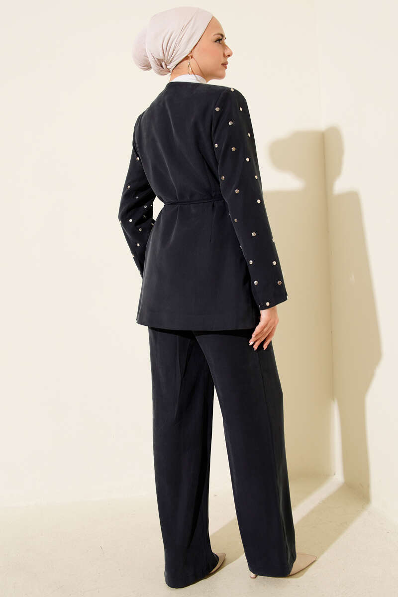 Zımbalı Ceketli Tencel İkili Takım Siyah