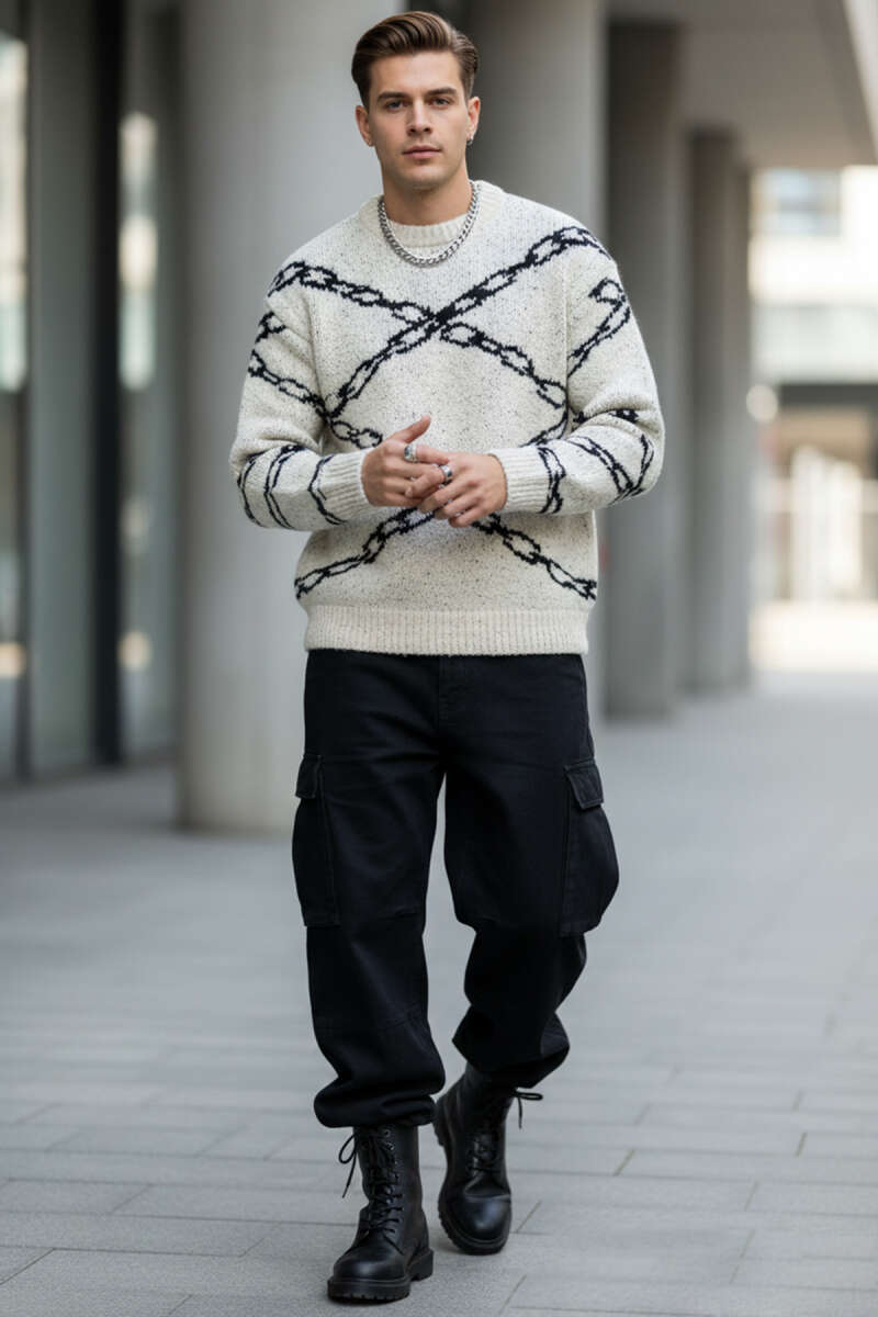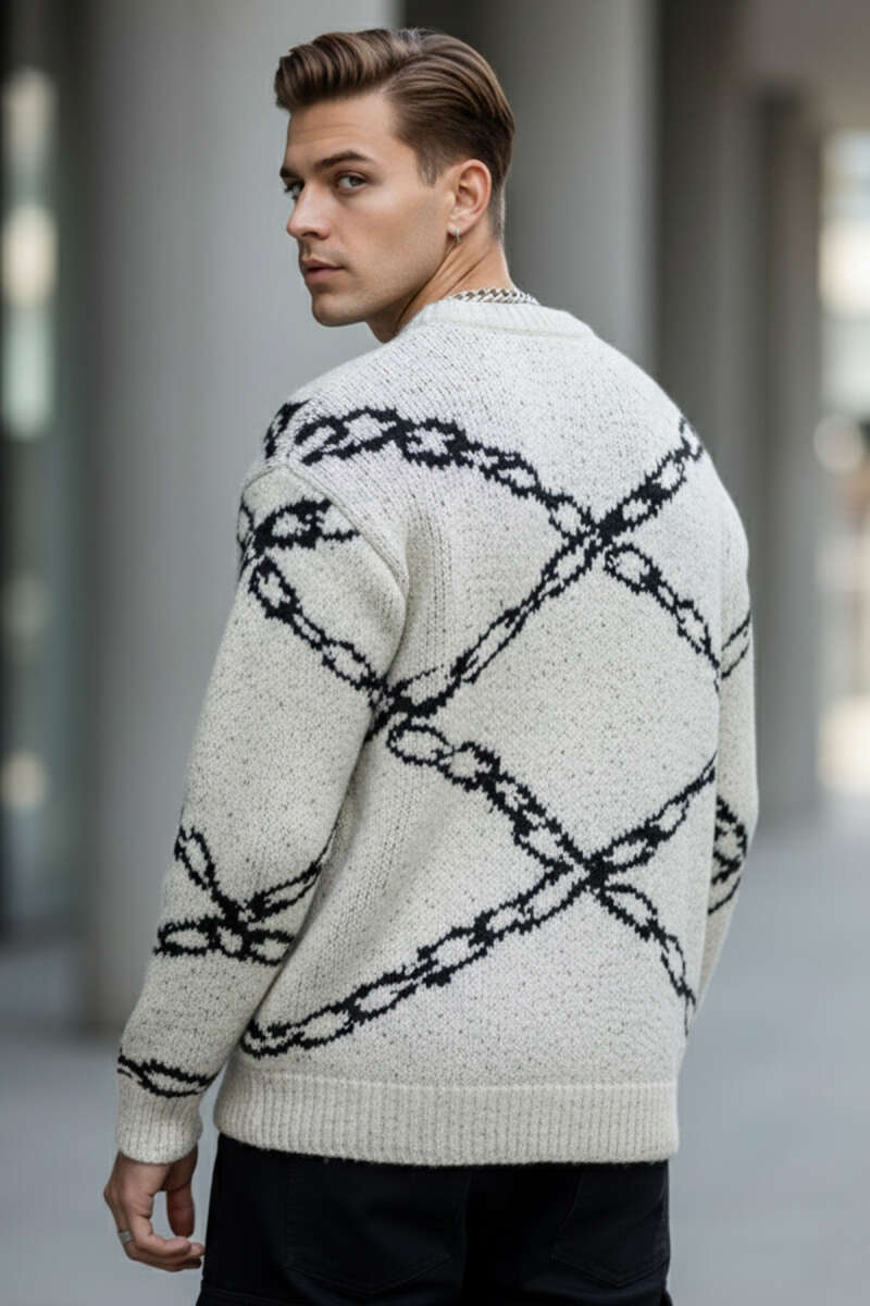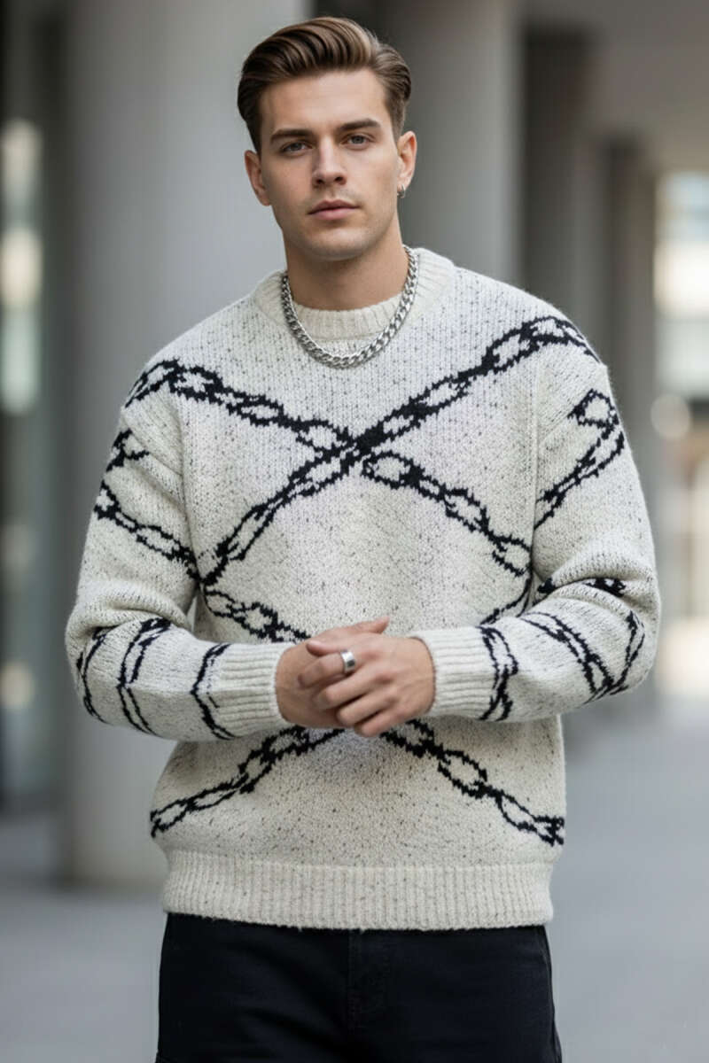 Zincir Desen Örme Triko Erkek Kazak Krem
