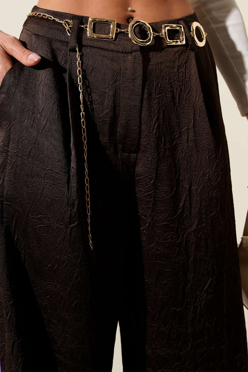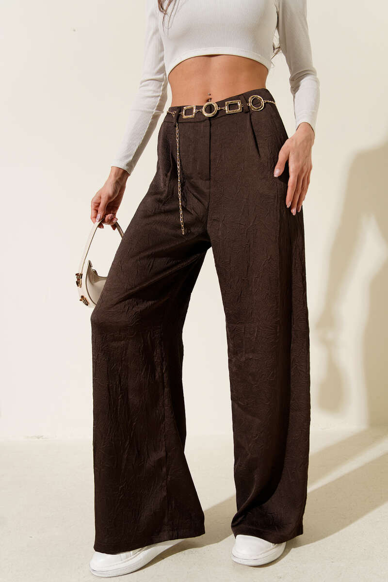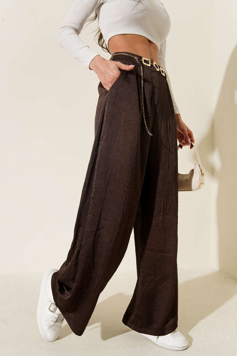 Zincir Kemerli Kırışık Saten Pantolon Kahve