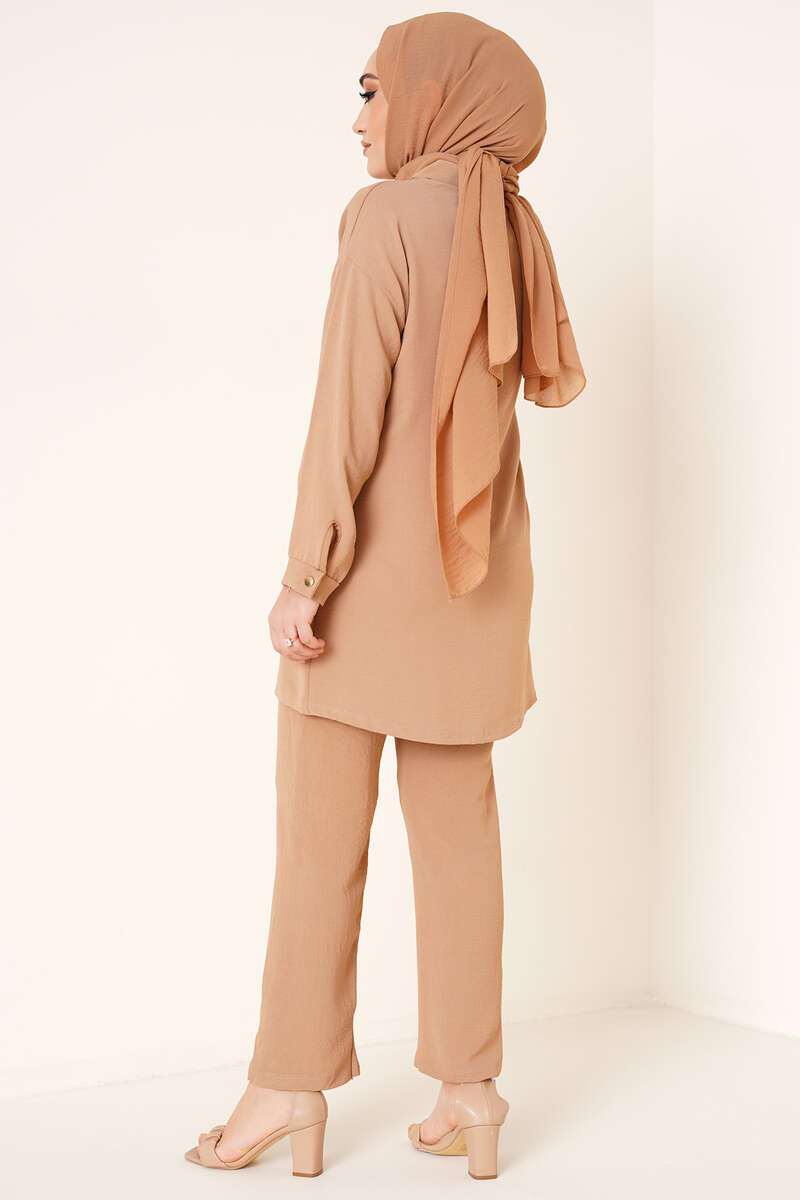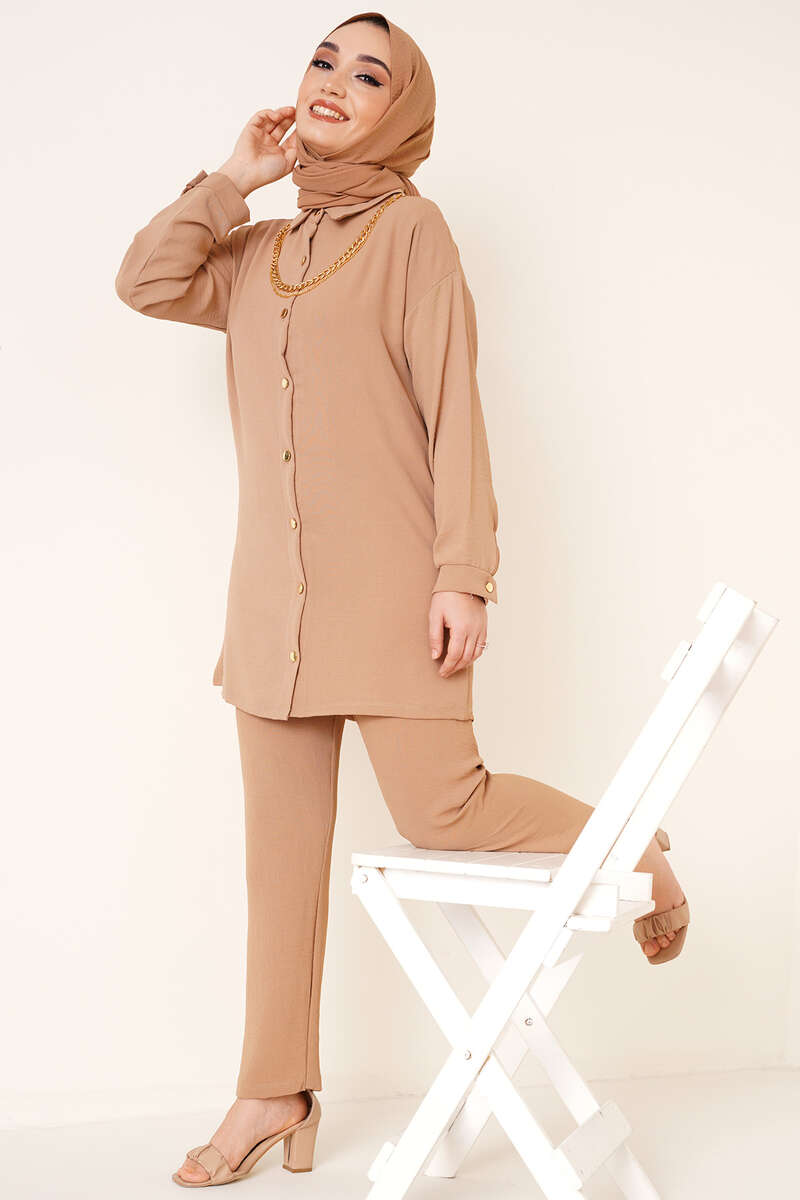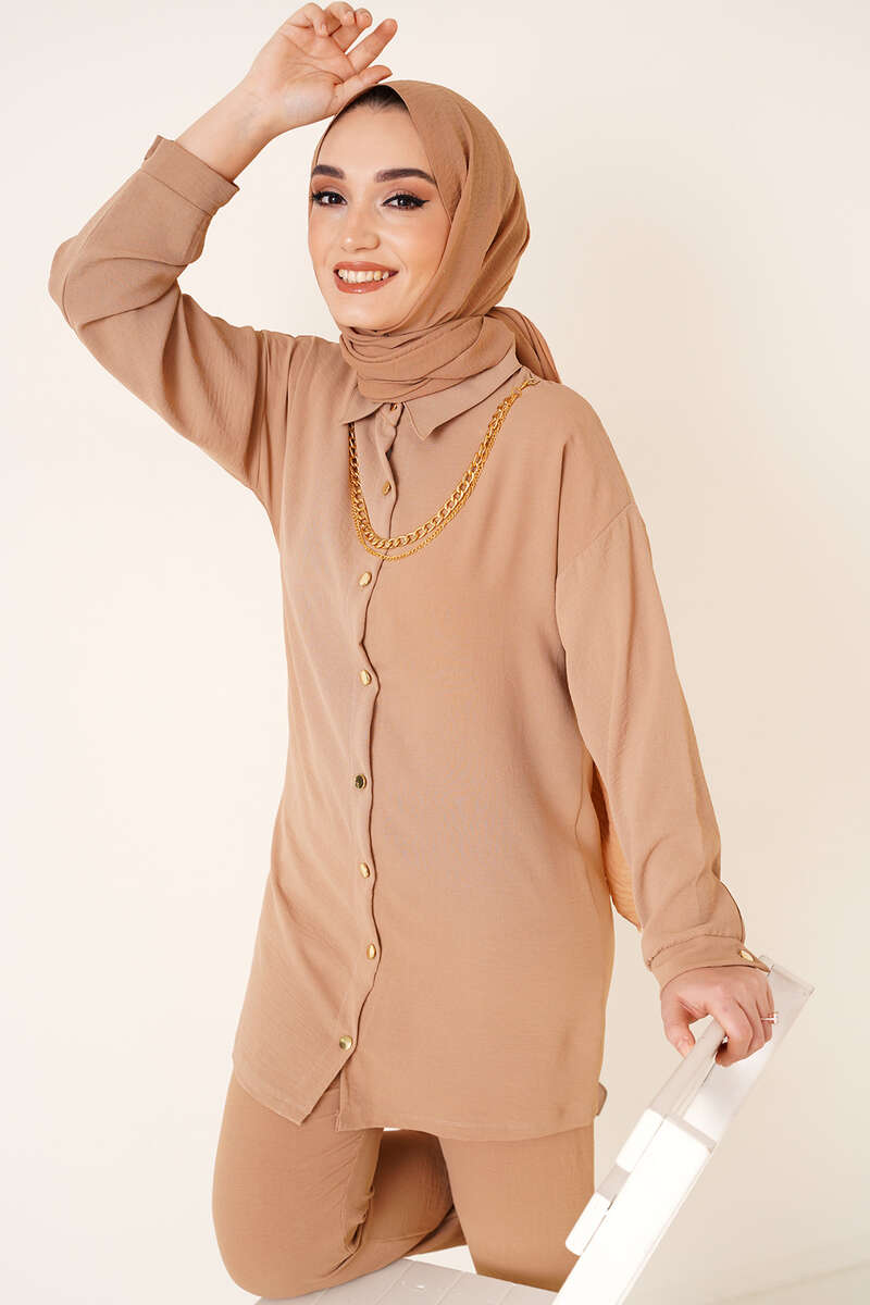 Yeni sezon ayrobin ikili takım günlük şıklığınızı arttıracak. İkili takımımızn tuniği zincir kolyelidir. Kolyesi çıkarılıp takılabilmektedir. Düğmeleri de zincirle uyumlu renktedir. Düşük omuz model olan tuniğimiz klasik yakadır. İkili takımımızın pantolonu bel lastiklidir. Cepsiz modeldir.