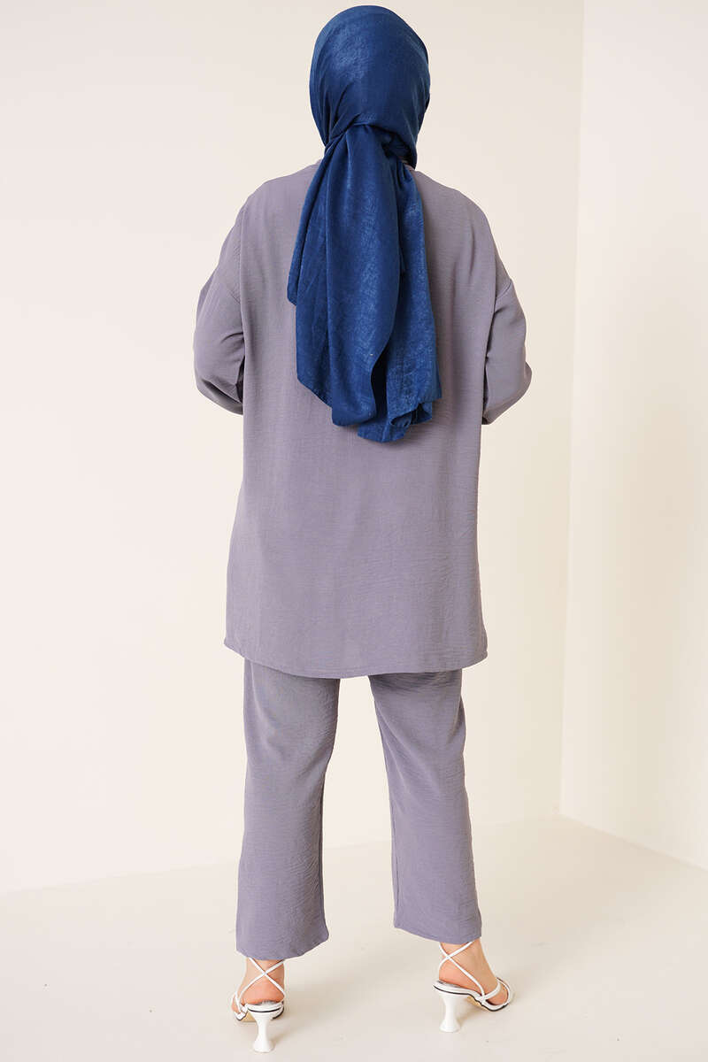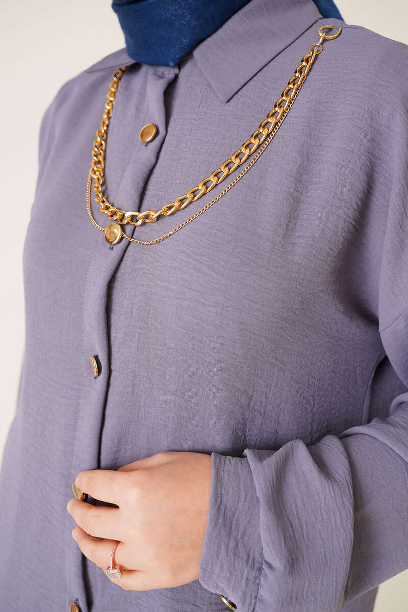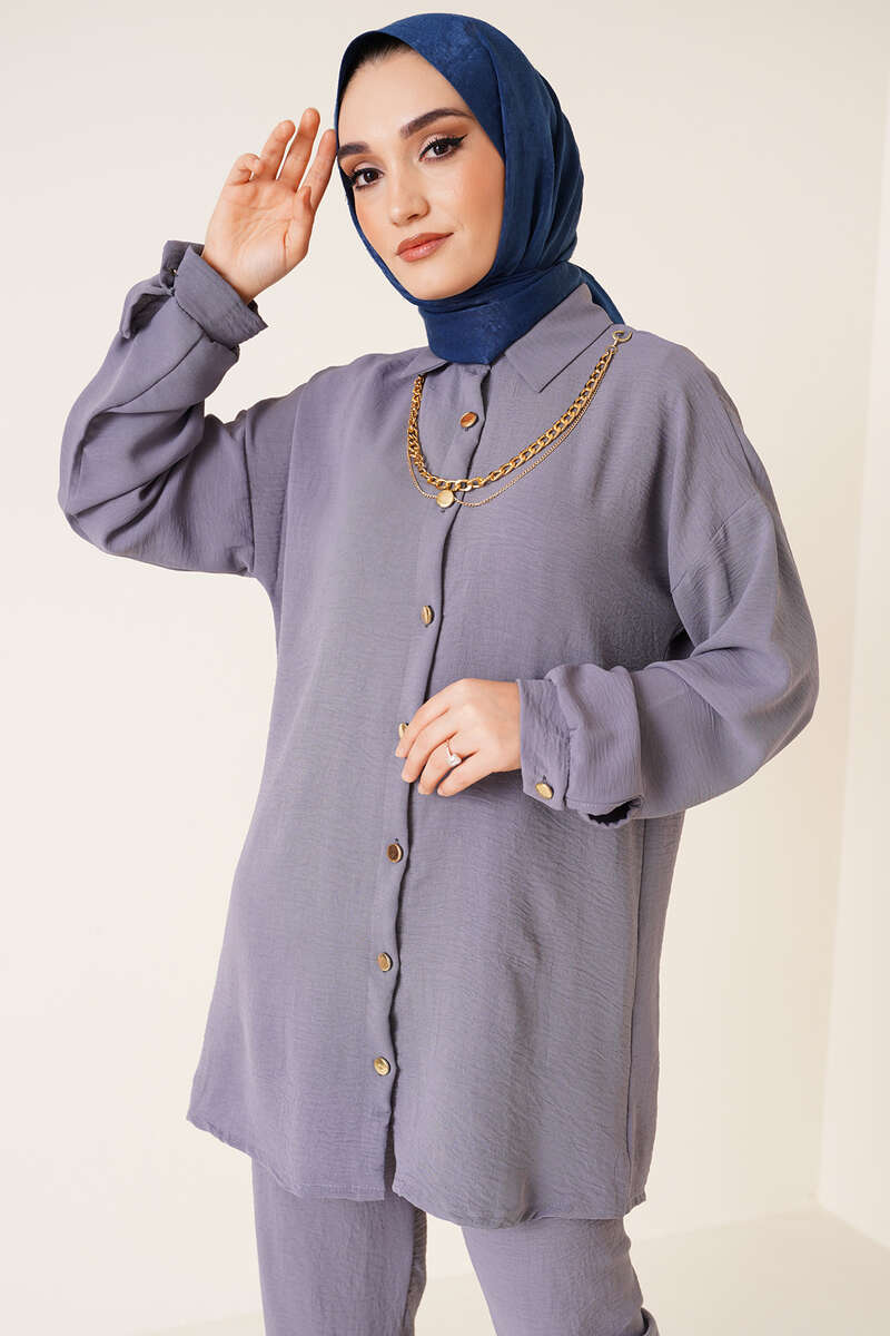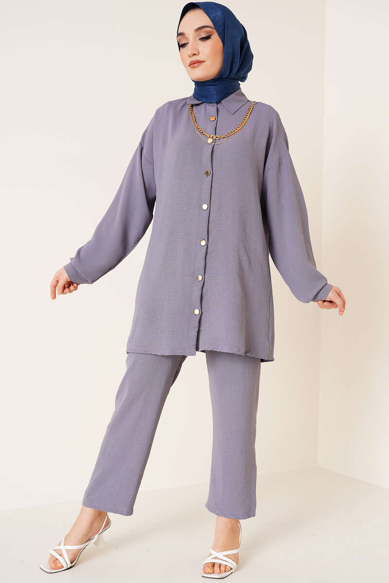 Yeni sezon ayrobin ikili takım günlük şıklığınızı arttıracak. İkili takımımızn tuniği zincir kolyelidir. Kolyesi çıkarılıp takılabilmektedir. Düğmeleri de zincirle uyumlu renktedir. Düşük omuz model olan tuniğimiz klasik yakadır. İkili takımımızın pantolonu bel lastiklidir. Cepsiz modeldir.
