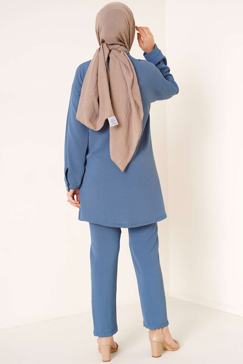 Yeni sezon ayrobin ikili takım günlük şıklığınızı arttıracak. İkili takımımızn tuniği zincir kolyelidir. Kolyesi çıkarılıp takılabilmektedir. Düğmeleri de zincirle uyumlu renktedir. Düşük omuz model olan tuniğimiz klasik yakadır. İkili takımımızın pantolonu bel lastiklidir. Cepsiz modeldir.