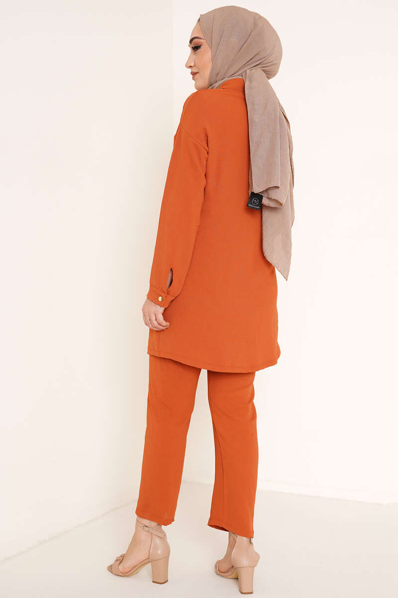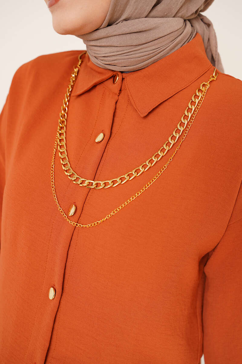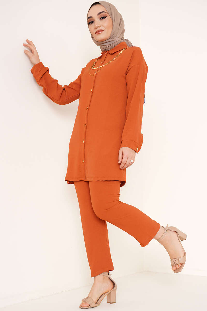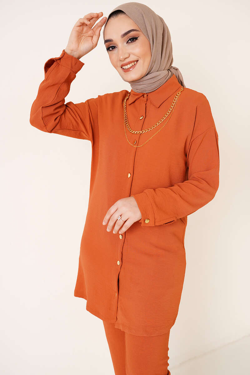 Yeni sezon ayrobin ikili takım günlük şıklığınızı arttıracak. İkili takımımızn tuniği zincir kolyelidir. Kolyesi çıkarılıp takılabilmektedir. Düğmeleri de zincirle uyumlu renktedir. Düşük omuz model olan tuniğimiz klasik yakadır. İkili takımımızın pantolonu bel lastiklidir. Cepsiz modeldir.