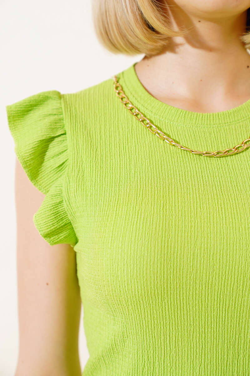 Yeni sezon bluzumuz bisiklet yaka modeldir. Yakasında bulunan zincir koleysi çıkarılıp takılabilmektedir. Omuzları fırfır detaylı olan bluzumuz kolsuz modeldir.