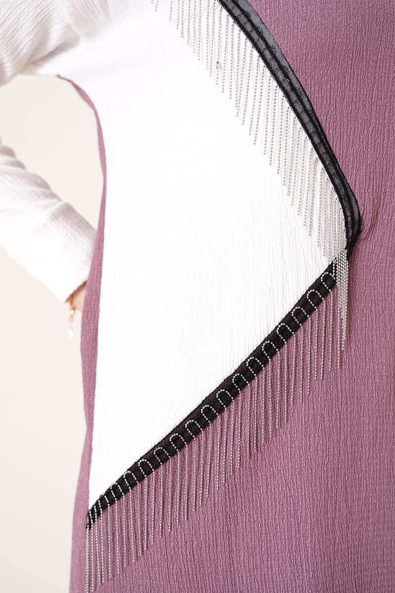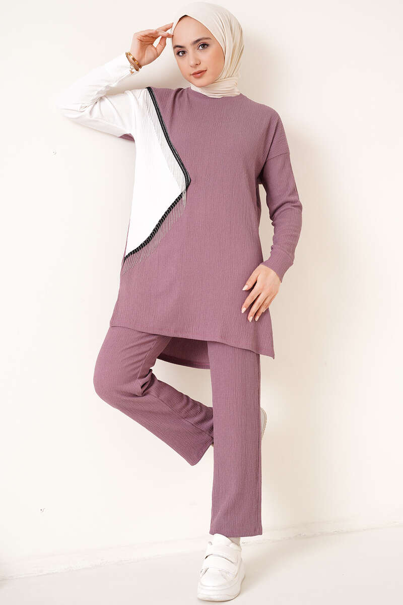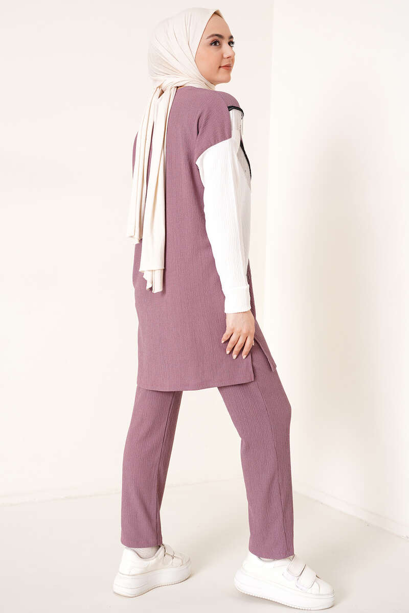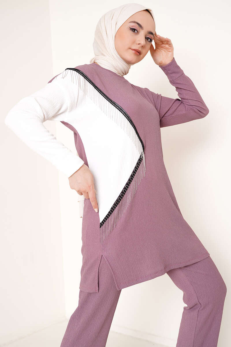 Yeni sezon bürümcük ikili takımımızın tuniği züncir püskülleriyle süslenmiştir. Gatnili tunik oval yakadır. İki yanında yırtmacı bulunan tuniğimiz düşük omuz modeldir. İkili takımımızın pantolonu cepsiz modeldir. Beli lastiklidir.